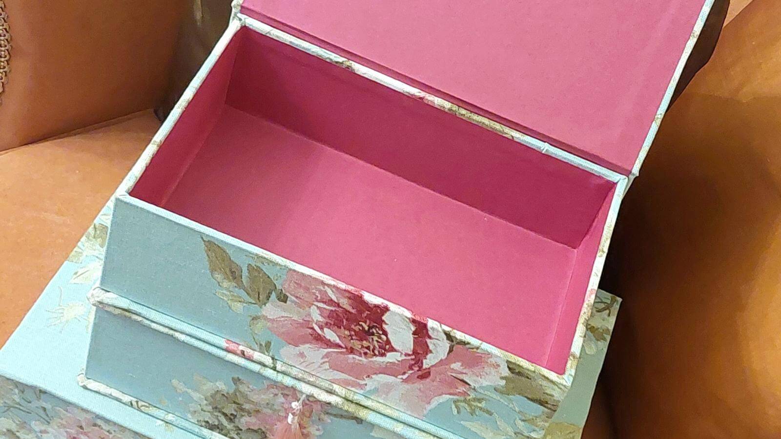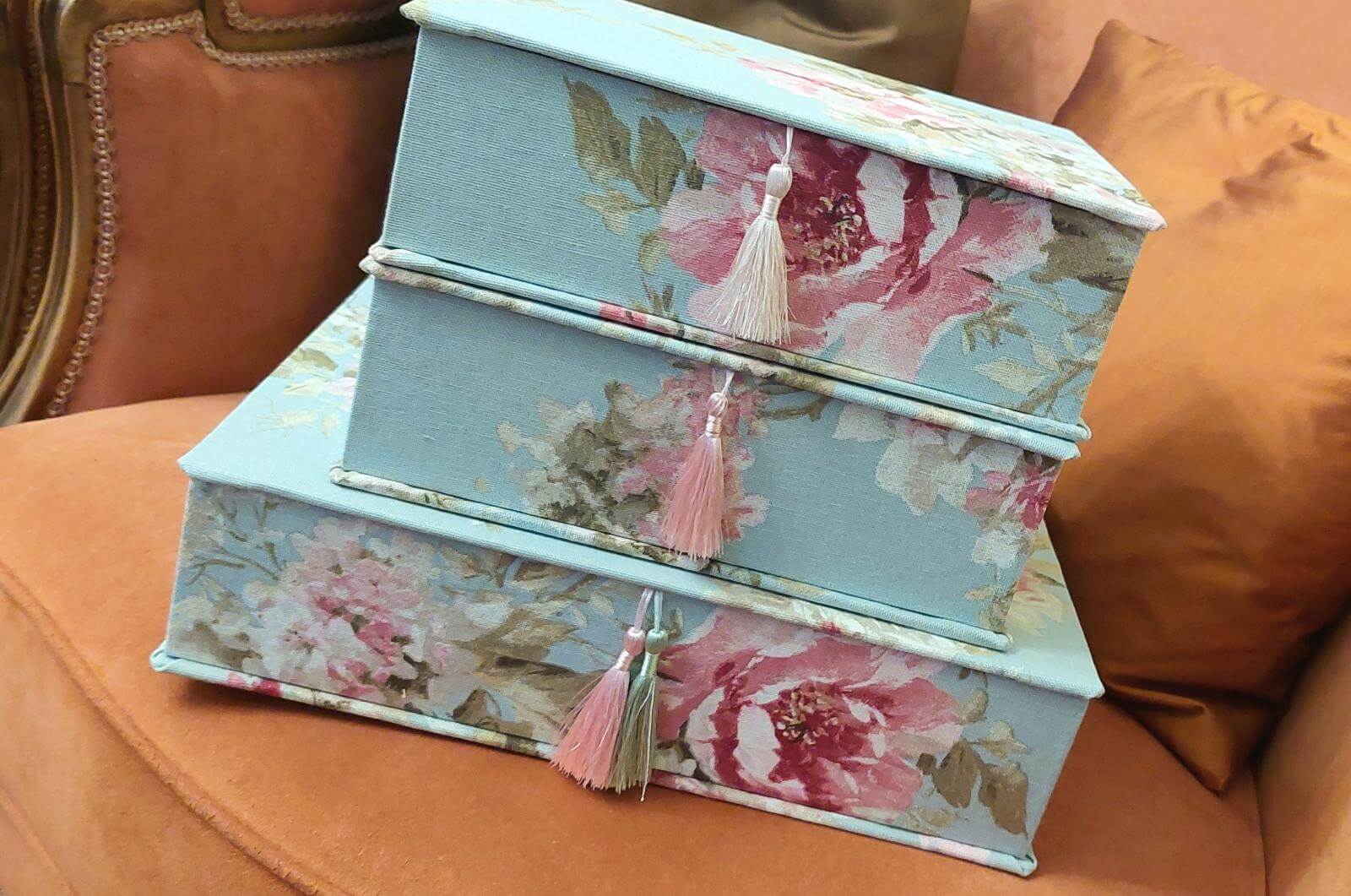 Und als ob der Tag 48 Stunden hätte, kam ein neues Hobby dazu: elegante Designer-Schachteln in Handarbeit hergestellt. Mit edlen Stoffen bezogen und seidigen Quasten versehen, erfreuen die bunten Preziosen die Herzen von Liebhaber*innen.